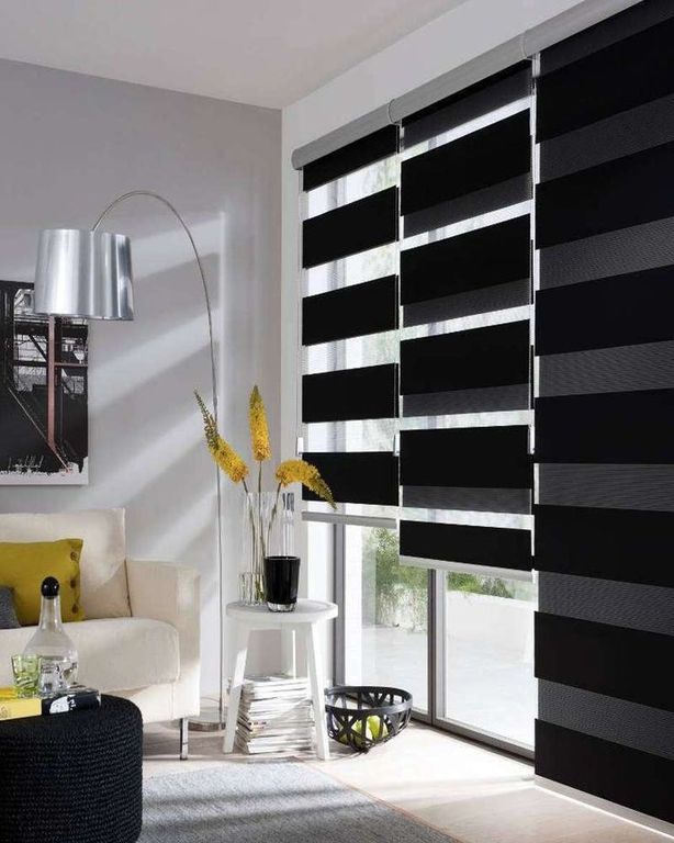 Самыми современными и дорогостоящими являются шторы типа «день-ночь», они отличаются тем, что на полотне имеются цветные и прозрачные полосы, которые двойным слоем закрывают окно от падающего света.